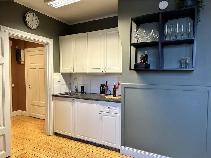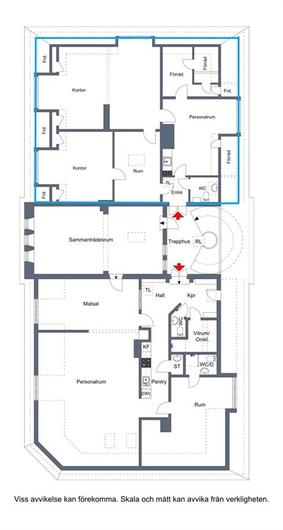 Kontoret om 123 kvm är genomgående nyrenoverat i mycket smakfulla färgval fördelat på 4 kontorsrum, personalrum med bra matplats, förråd samt . Genomgående trägolv och målade väggar. Lokalen kan hyras möblerad eller så finns möjlighet att köpa inredningen.