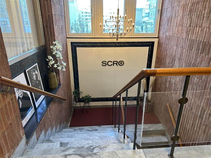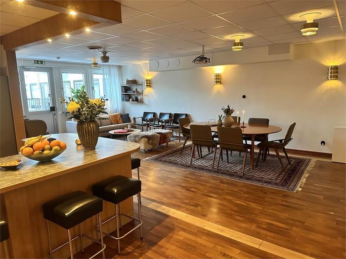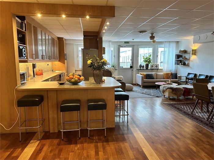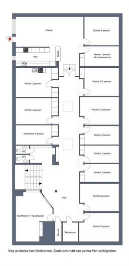 Lokalen har en egen inbjudande entré från Skolgatan 8 med en mindre sittgrupp samt trappa upp till kontoret som är mycket smakfullt inrett. När du kommer upp för trappan är det en öppen yta med ingång till ett kapprum och två toaletter direkt in till vänster. Direkt till höger finns ett väl tilltaget konferensrum följt av flera kontorsrum i varierande storlek där alla rum har rejäla fönster som ger ett bra ljusinsläpp. Flera av kontoren har plats för flera arbetsstationer eller kan nyttjas som samtalsrum eller mindre konferensrum. Längst in i lokalen finns mycket inbjudande sociala och öppna ytor med ett anslutande kök. Här finns plats för både stort matbord och soffgrupp samt utgång till en rymlig terrass. Det går även att bruka denna del som konferensrum. Hela lokalen är ca 393 kvm där kontoret är ca 337 kvm och källarförrådet är ca 24 kvm, övriga ytor är entré och trapphuset.