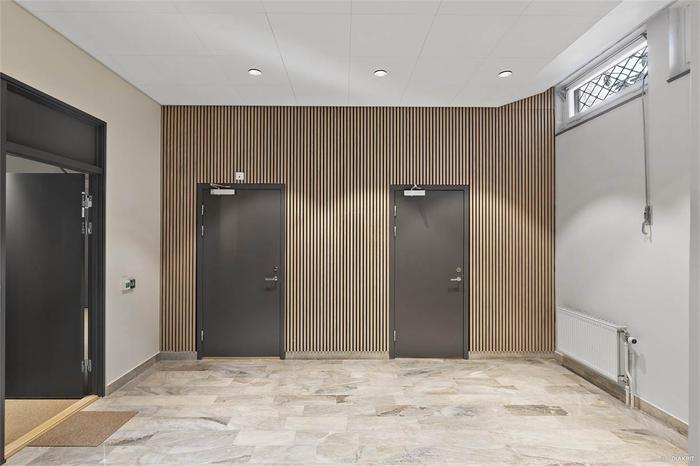 Kontoret om 450 kvm är rumsindelat med 8 rymliga kontorsrum som inrymmer flertalet arbetsplatser, mötesrum samt ett större lunchrum med fullt utrustat kök. Tack vare fönster i två väderstreck och det höga läget i huset ges ett mycket generöst ljusinsläpp. I lokalen finns fyra toaletter varav en är handikappsanpassad.