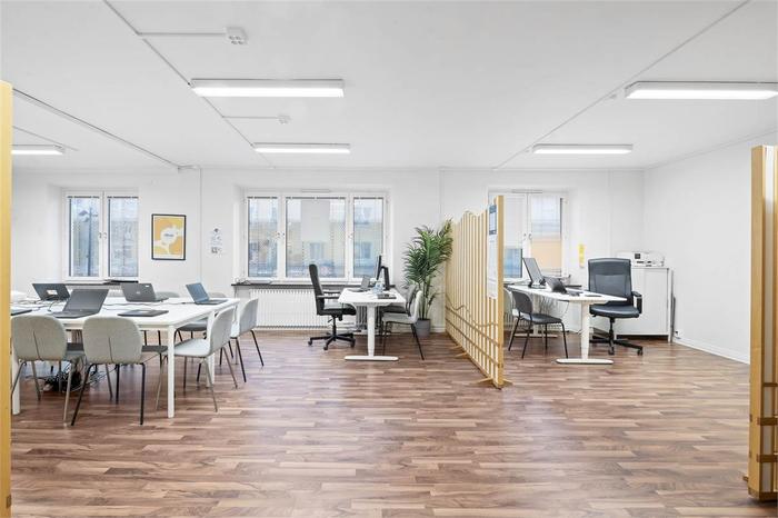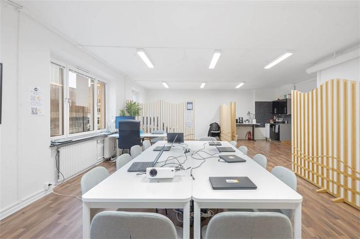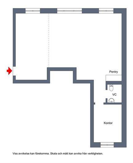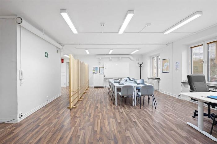 Öppen lokal med generöst ljusinsläpp. Lokalen är försedd med pentry, WC och ett stort kontorsrum/konferensrum.