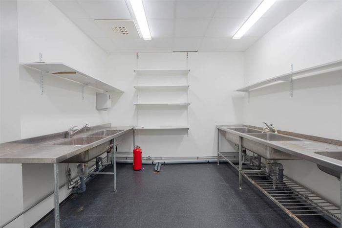 Planlösning:Planlösningen fördelar sig på en större öppen yta med flertalet fönster samt två entréer. I lokalens bakkant finns ett kök med diskbänk (fettavskiljare finns), en RWC samt ett lagerutrymme. Dessutom erbjuds ett pausrum med pentry samt ytterligare ett lager.
