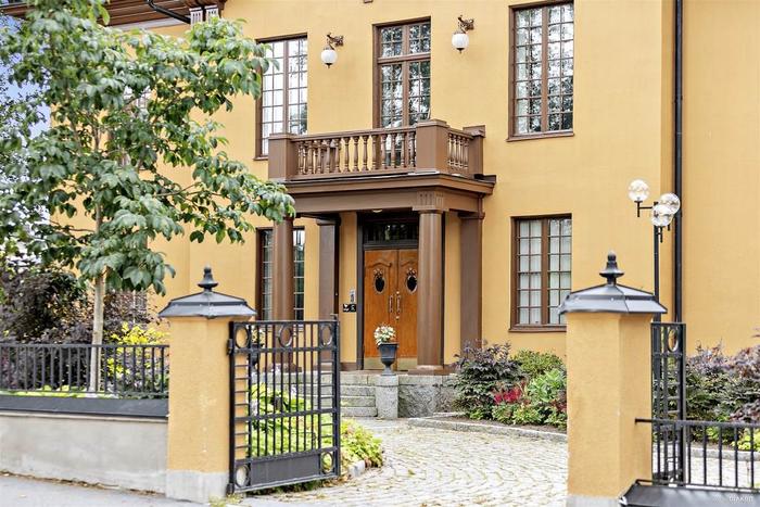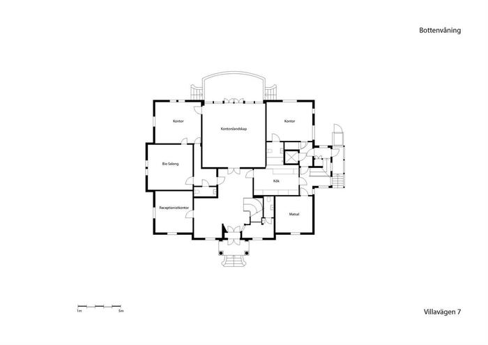 I huvudbyggnaden inrymmer bottenplanet en stor välkomnande hall som leder dig rakt in i en stor sal med stora vackra fönster och utgång till den grönskande trädgården. Från hallen nås även en stor pampig trappa som tar dig upp till nästa plan. På nedre botten finns ytterligare tre rum och även ett kök med tillhörande matrum samt toalett.