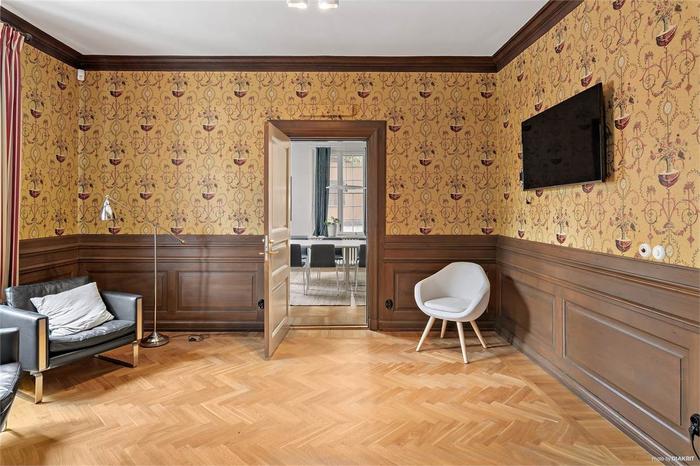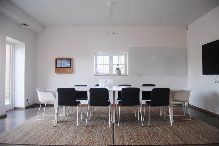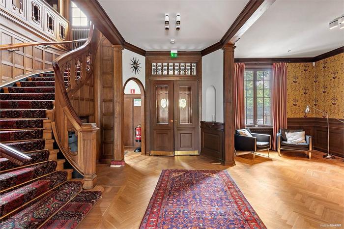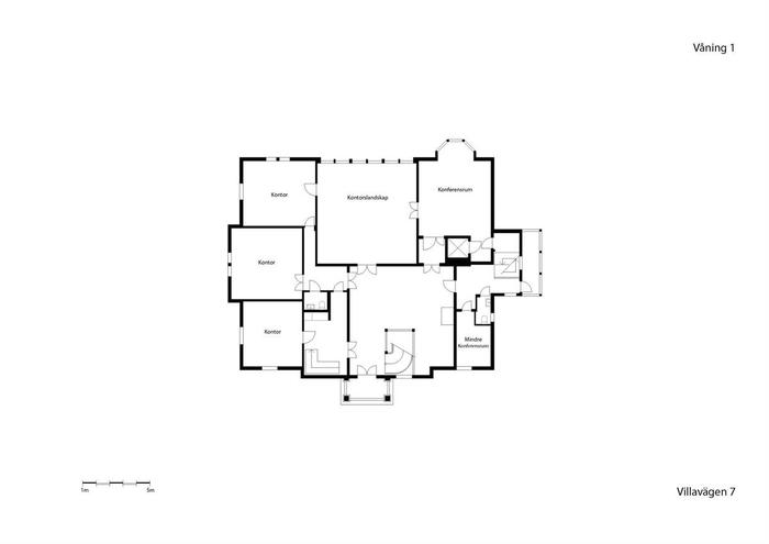 På plan 1 är det ett stort allrum direkt när man kommer upp med plats för soffgrupper samt en öppen spis och stora vackra fönster. Här finns ingång till fem rum samt ett större konferensrum som vetter ut mot trädgården. Det finns även två toaletter.