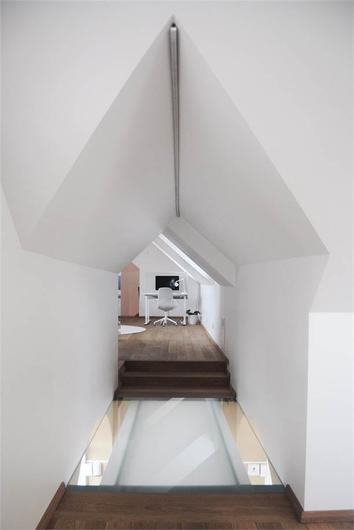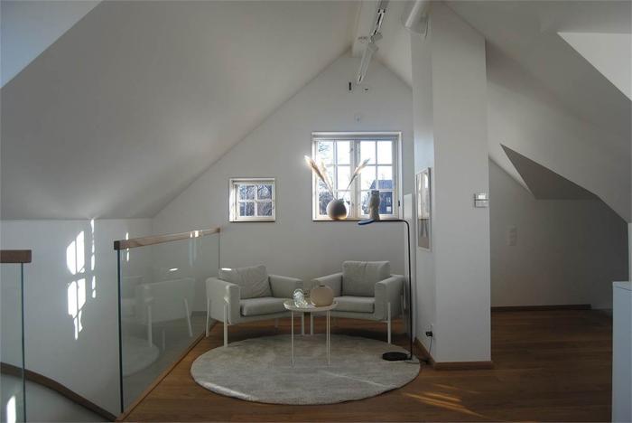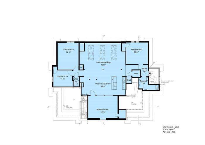 Vindsplanet om 193 kvm som nås från trapphuset vid sidan om byggnaden har en stor öppen yta för kontorslandskap och personalutrymme med pentry och rymlig yta för sittplatser. Här finns tre separata stora kontorsrum och ett större konferensrum.