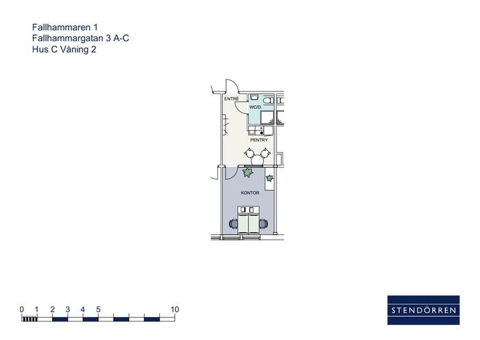Lokal på våning två med egen ingång, pentry samt toalett med dusch. Det finns även ett rum som kan användas till kontor.