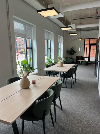 Varierad planlösning med stora gemensamhetsytor, coworkingytor, mötes- och konferensrum, telefonrum samt kontor i olika storlekar.