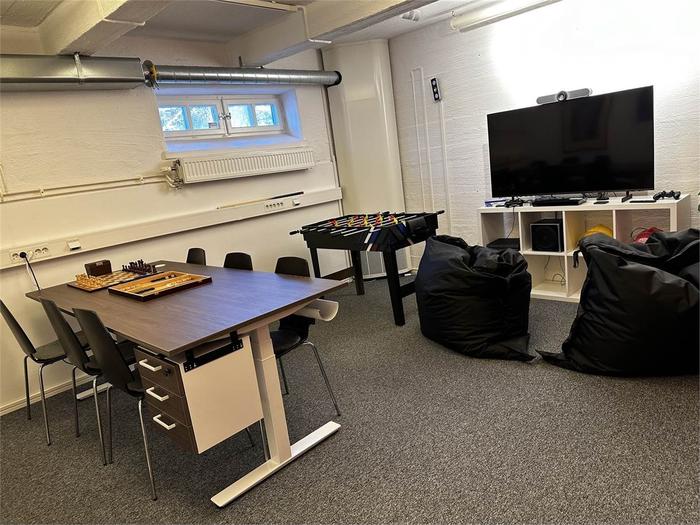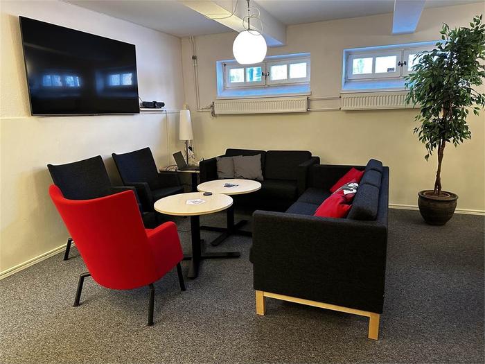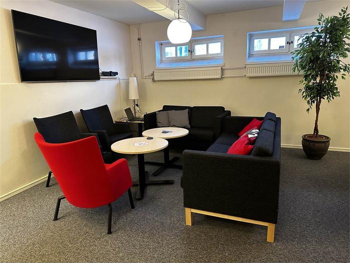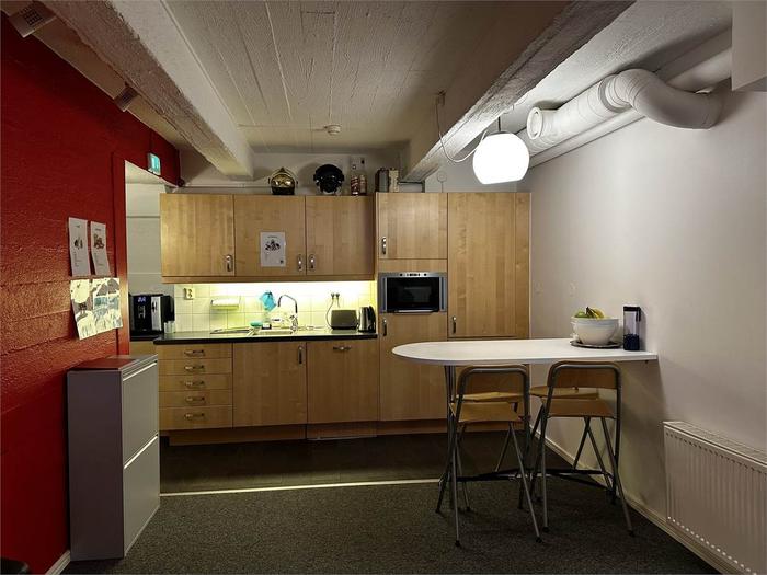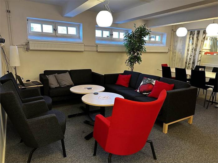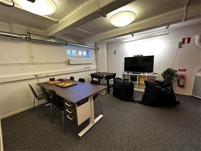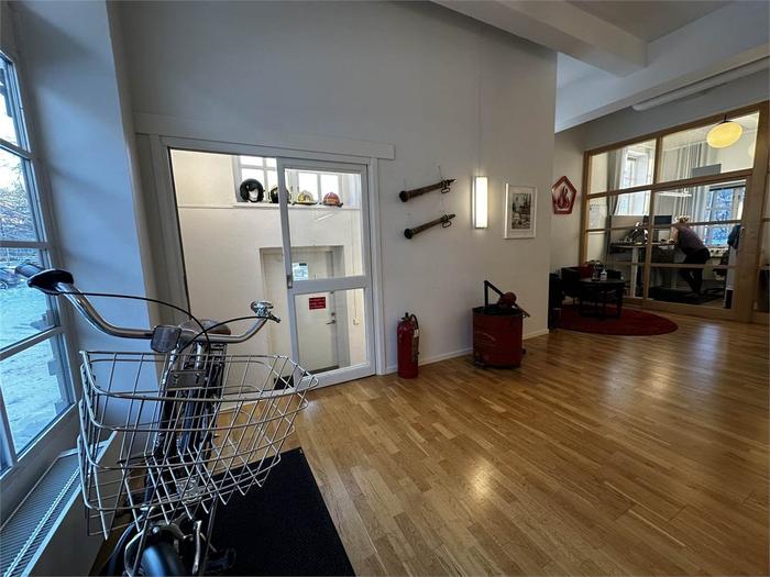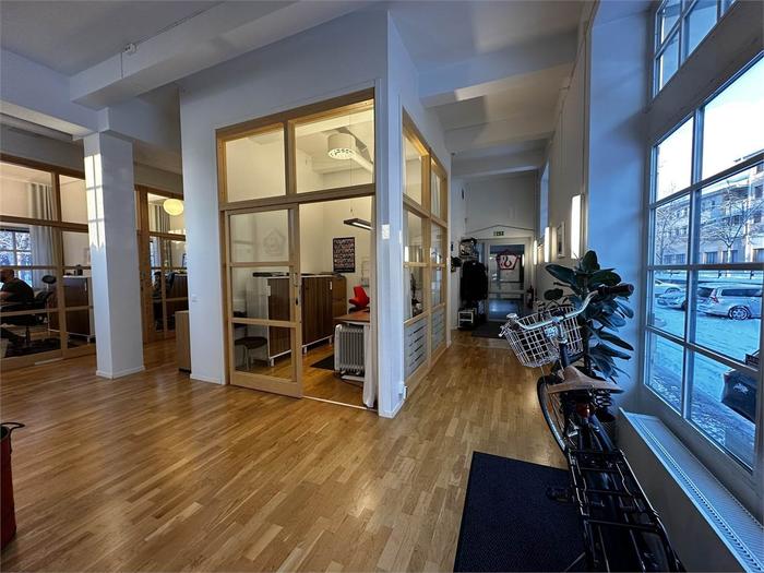 Lokalen om 228 kvm erbjuder på övre planet en hall med plats för ytterkläder och två toaletter. Vidare in i lokalen finns flera kontorsrum med en yta för soffgrupp i mitten. En trappa ner finns en större social yta med anslutande pentry. Här finn splats för både stort matbord och soffgrupp. Det finns även två större rum för flera arbetsplatser eller konferens samt bastu med dusch. Markplanet har en yta om 112 kvm och källarytan 116 kvm.