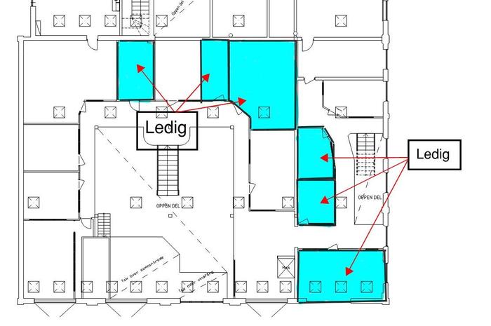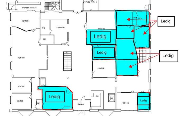 Planlösning:Kontorshotell med kontor i olika storlekar.