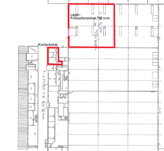 Planlösning:Lagerlokal om ca 750 kvm + 60 kvm kontor.