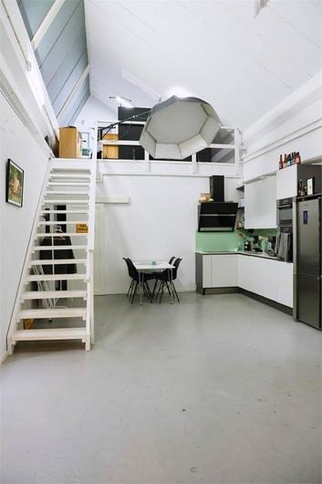Lokalen har en härlig takhöjd med takfönster, ett entresol och flera förråd.