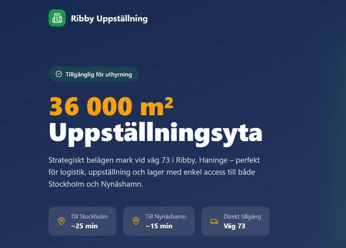 Nu erbjuds en ovanligt välutrustad och flexibel markyta för uthyrning iVästerhaninge - Fors, i direkt anslutning till väg 73 med mycket god tillgänglighet mot såväl södra Stockholm som Nynäshamn.