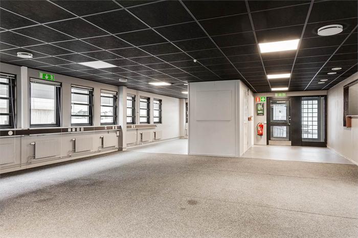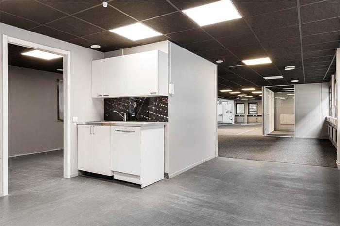 Kontorsdelen om 190 kvmrymmer både öppna arbetsytor och mindre kontorsrum samt kompletta faciliteter såsompentry, omklädningsrum och WC.