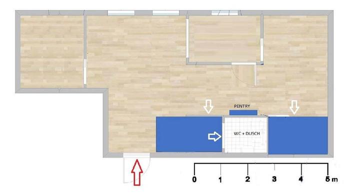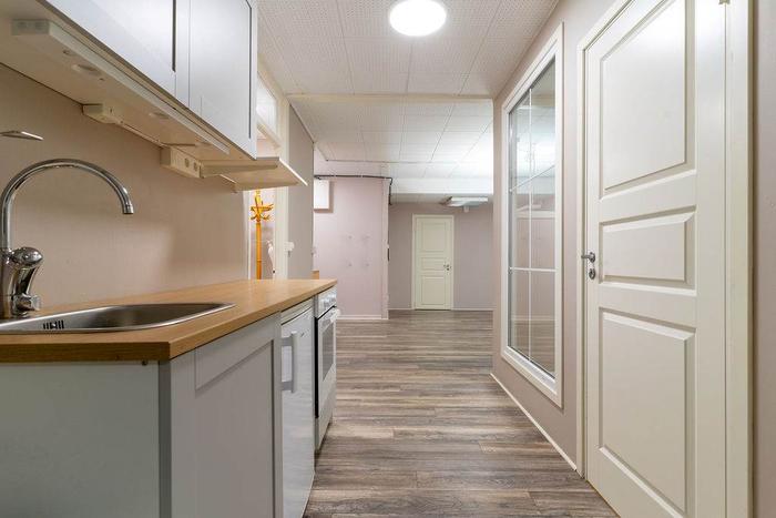 Planlösningen fördelas på en välkomnande öppen entréyta, ett mindre kontorsrum samt en öppen fönsterlös yta längst in i lokalen som med fördel kan nyttjas som ett mindre lager. Det finns även ett rymligt förråd direkt till vänster i anslutning till entrén. Pentryt är placerat i den öppna ytan mitt emot arbetsrummet. Det finns även ytterligare ett rum med pentrybänk och ett kassaskåp samt en fräsch wc med duschkabin.