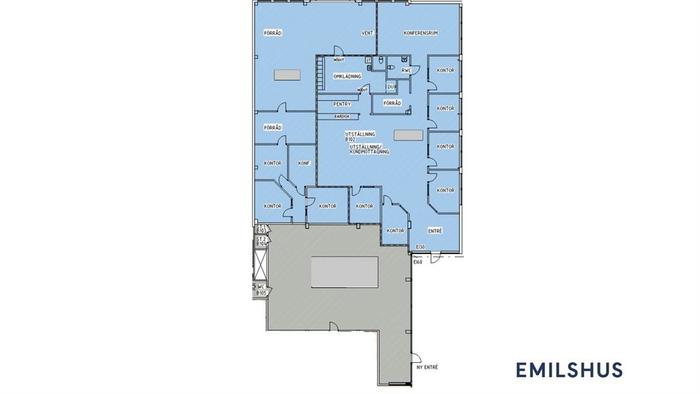 Planlösning:Kontor på markplan med tillhörande lager i direkt anslutning till lokalen.