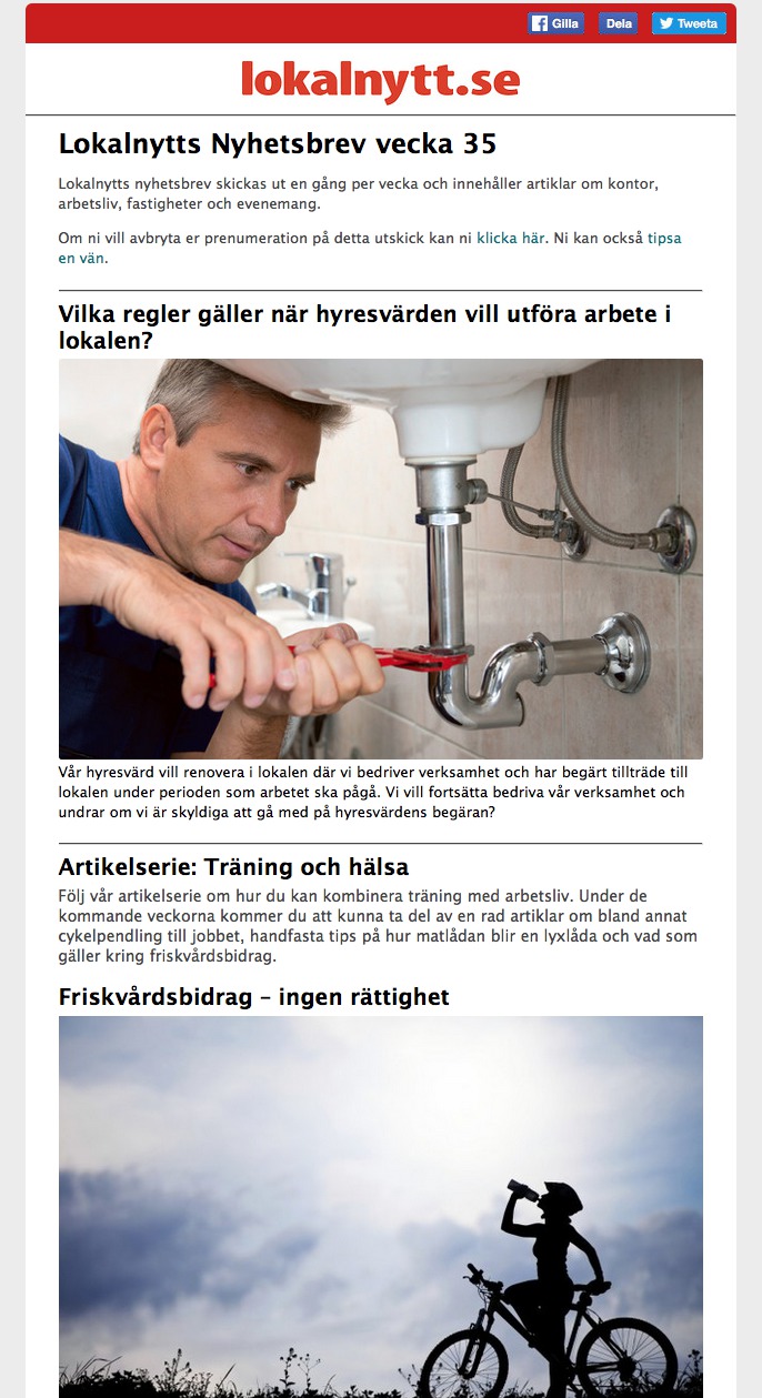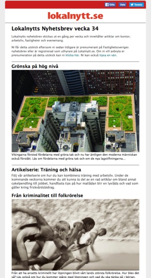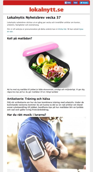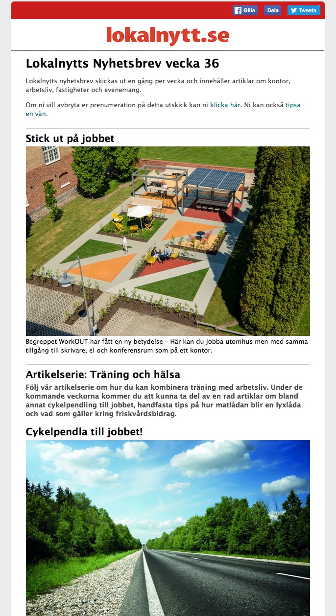 Lokalnytts nyhetsbrev skickas ut en gång per vecka och innehåller artiklar inom kontor, arbetsliv, fastigheter och evenemang.