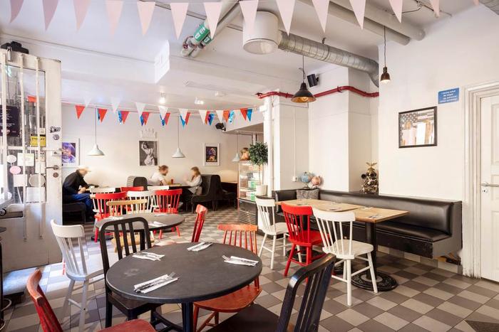 Mysiga lokaler med fönster ut mot gatan och bra köksutrymme med alla nödvändiga faciliter. Stor härlig uteservering som alltid ger ett välkomnande intryck.