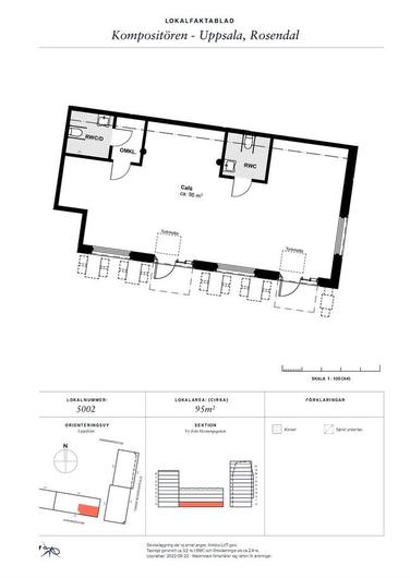 Lokalen om 95 kvm har 3 meter i takhöjd. Det är idag en råyta men lokalen kommer färdigställas med två RWC och kök/beredningsrum för caféverksamhet. Det är stora fönster i lokalen som vetter ut mot gatan och det nya torget Rosendals torg. Uteservering längs fasaden mot torget är även möjlig.